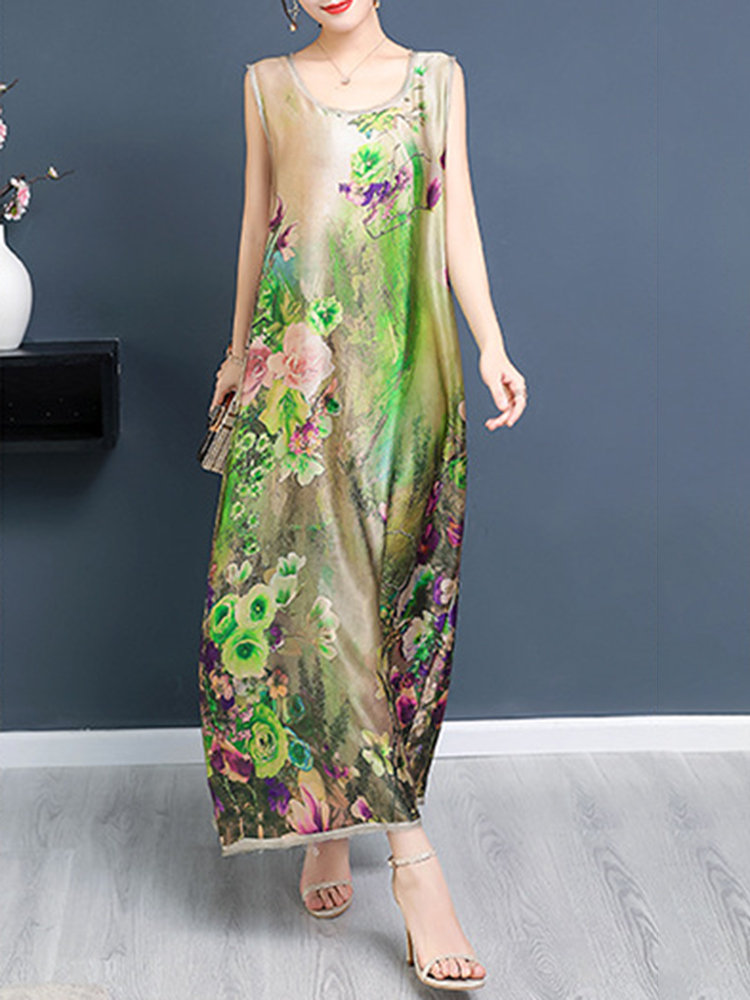 Side Splited Floral Print Elegant Sleeveless Maxi Dresses