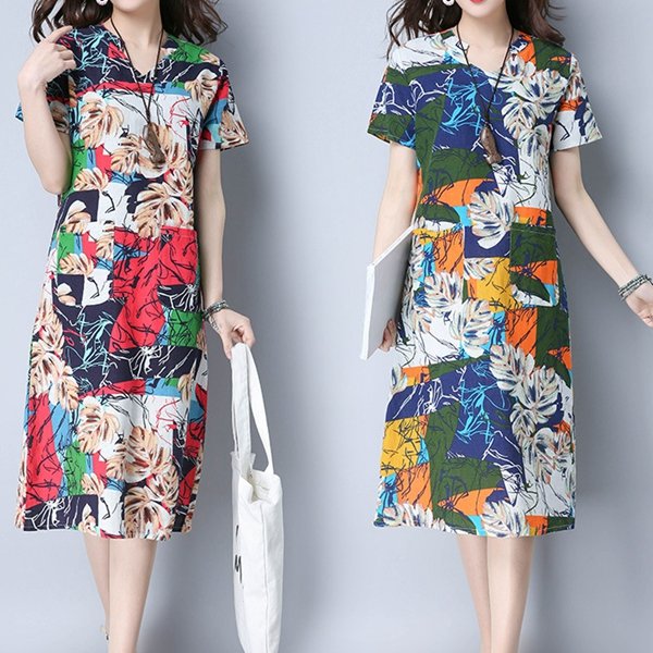 Vintage Random Print Short Sleeve V-neck Dress For Women
