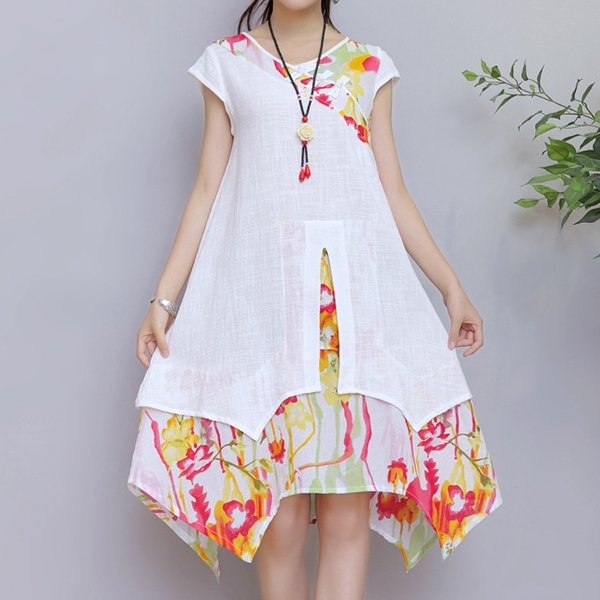 Floral Print Fake Two Piece Short Sleeve V-neck Dress For Women