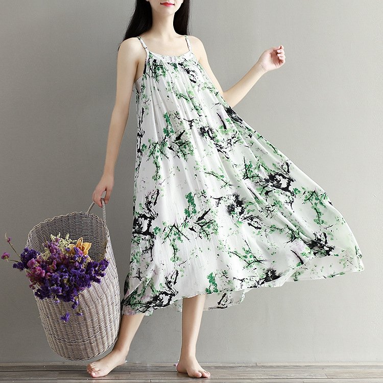 Flowy Ink Print Spaghetti Strap Loose O-neck Maxi Dress For Women